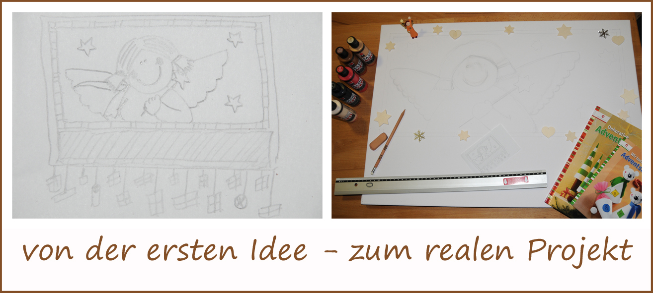 Bereits vor knapp 1 1/2 Jahren habe ich mir Gedanken darüber gemacht, was für einen Adventskalender ich für mein Patenkind Lena basteln könnte. Zu diesem Zeitpunkt war sie aber eh noch zu klein dafür und so ist es bei der Skizze geblieben. Diese ist aus mehreren Ideen aus Büchern sowie meiner eigenen Ideen heraus (Engel) entstanden.